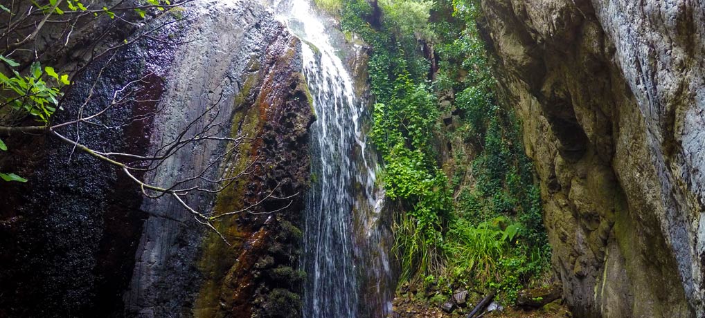 Sólo el sonido del agua caer nos indica que estamos cerca, porque verla, no la vemos. Para tenerla justo delante hay que caminar por una especie de pasillo rocoso donde habrá que extremar la precaución por la humedad del terreno. Casi sin darnos cuenta y como un regalo inesperado, aparece la chorrera de Jigareo. Abrigada con hiedras, el agua se escurre a lo largo de unos seis metros entre la roca formando un minúsculo charco. Apenas hay perspectiva para fotografiarla puesto que estamos en un reducido habitáculo donde solo se escucha el sonido del agua golpear con el granito erosionado. Es como tener una cascada en el salón de casa. Indescriptible.